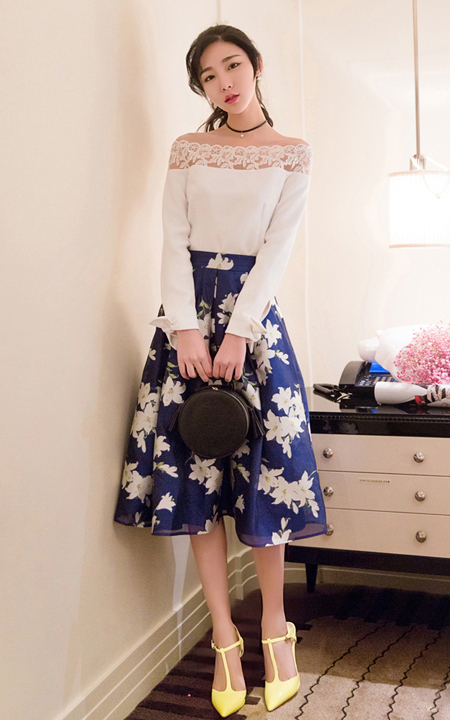 性感一字领打底衫,蕾丝的拼接设计,散发迷人的风情,搭配漂亮的半身裙,印花的点缀,优雅动人!