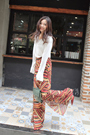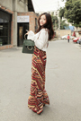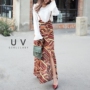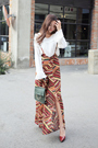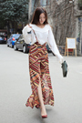 在低调的白色雪纺衫之中透露隐隐女人味的穿搭。甜美而爽朗的自然之美,搭配几何条纹的雪纺阔腿裤,增添几分异域风情。