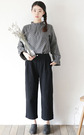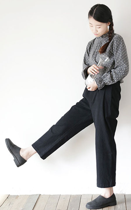 很日系的一款点点衬衫。低调的灰色,料浅色的点点有点乖巧可爱,搭配麻质阔腿裤,超级显瘦,很有范。
