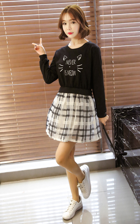 猫咪形状字母印花图案,显得青春活力,韩范儿风格甜美可爱,搭配女神最爱小白鞋!简约时尚百搭推荐。