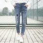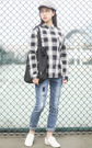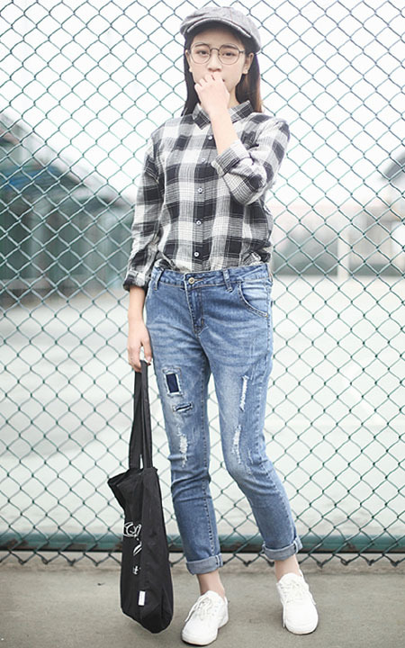 翻领棉麻格子衬衫,静雅古朴的棉麻材质,手感温软,穿起来透气舒适,搭配补丁牛仔裤,干净利落。