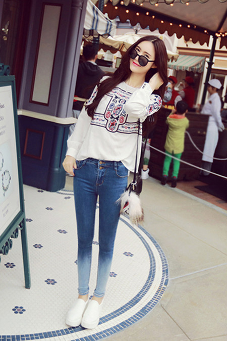重工刺绣工艺,有点民族风的feel,简约白打底,刺绣好看到极致,搭配渐变色牛仔裤,非常特别的一套,足够让你赚足眼球呀~
