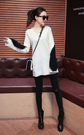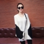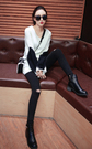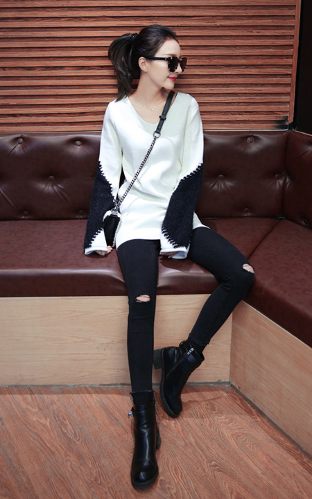 中长款针织毛衣,袖子拼色的设计,个性时髦,搭配黑色小脚裤,膝盖破洞,凸显女人的优雅魅力!