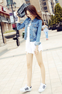 两个色系的牛仔外套,深蓝+浅蓝,上身特别硬朗,春天搭配长短tee都好看哟,下身可搭配短裙或者短裤,总之很百搭哟