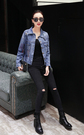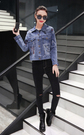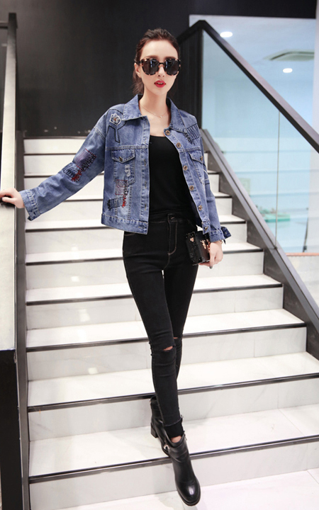 韩版时尚牛仔外套,翻领的设计,版型很好,魅力十足!搭配黑色小脚裤,走到哪里都很抢眼。
