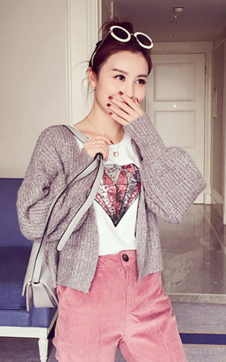 温暖的开衫外套,在早春的季节里看着都让人觉得暖暖的搭配多图案时尚俏皮亮片短袖T恤和灯芯绒小脚休闲长裤时尚又有范