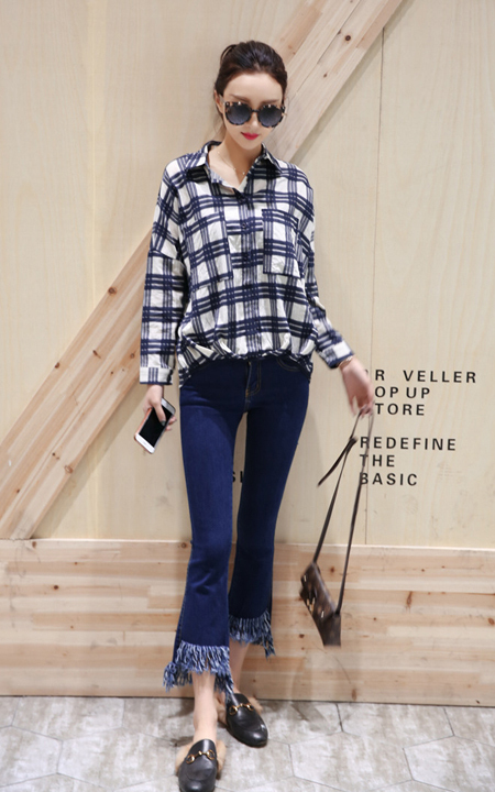 时尚大气的衬衫,经典的格子,百搭不过时,配一条个性的牛仔裤,流苏的点缀,尽显女人的帅气风范儿!