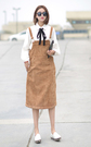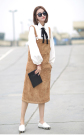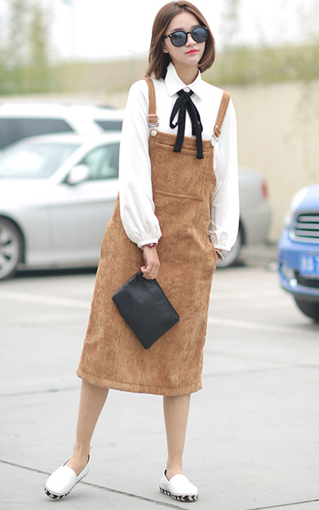 简单的白衬衫,蝴蝶结的装饰,很有韩范,搭配简单的灯芯绒背心裙,时尚又减龄!