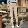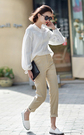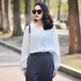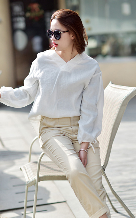 一款宽松大板型的衬衫。领口是带点小性感的V字领,显得脖子修长美腻,搭配休闲长裤,真的很有风范儿!
