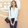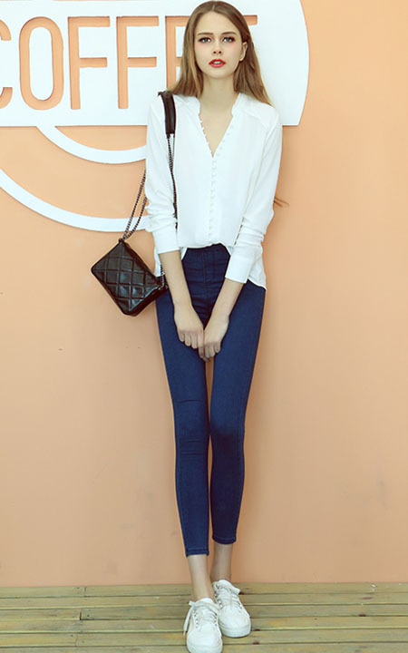 简洁的白色V领衬衫,领口处的小装饰让衣服更加吸睛,搭配修身打底裤,更具时髦休闲范。