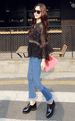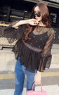 定位民族风的刺绣,与性感透明黑搭配,别具一格的设计~搭配个性下摆毛边微喇叭九分裤+尖头系带厚底低帮鞋鞋子!