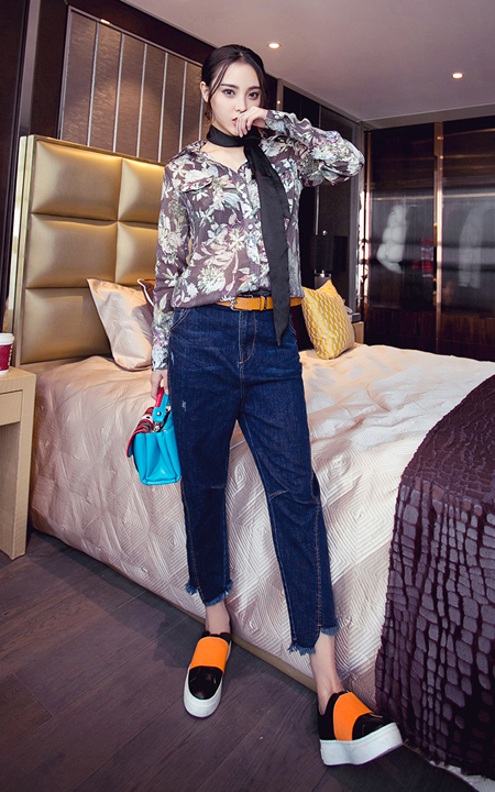优雅印花衬衫,有点透视的效果,上身效果极佳,搭配休闲牛仔裤,不规则的裤腿,个性时尚,很有韵味。