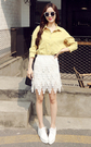 超级好看的吸睛蕾丝T恤+短裙套装,蕾丝钩花仙女又浪漫哦,搭配尖头高跟鞋时尚又好看~