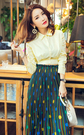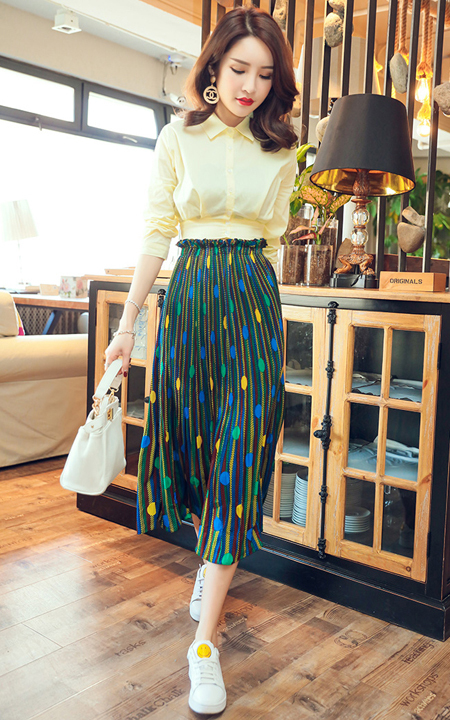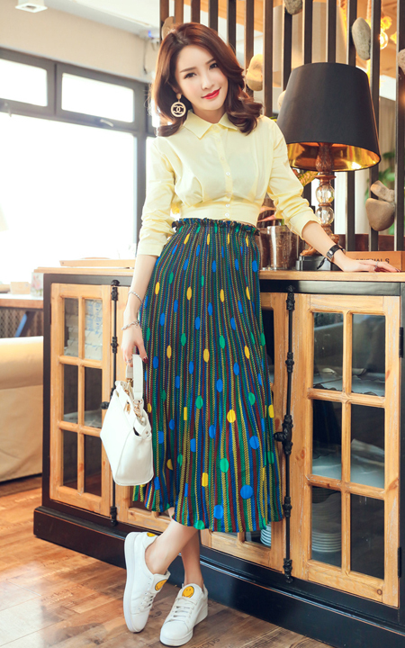 明亮的黄色衬衫,收腰的设计,上身很不错,搭配漂亮的半身裙,波点与百褶的结合,散发迷人的魅力!