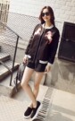 经典时髦棒球衫外套,前片后背有重工刺绣贴布图案,门襟拉链设计,搭配百搭短裤和厚底低帮鞋,穿着很舒适,个性十足。