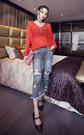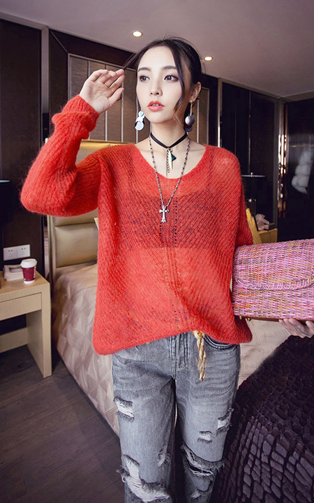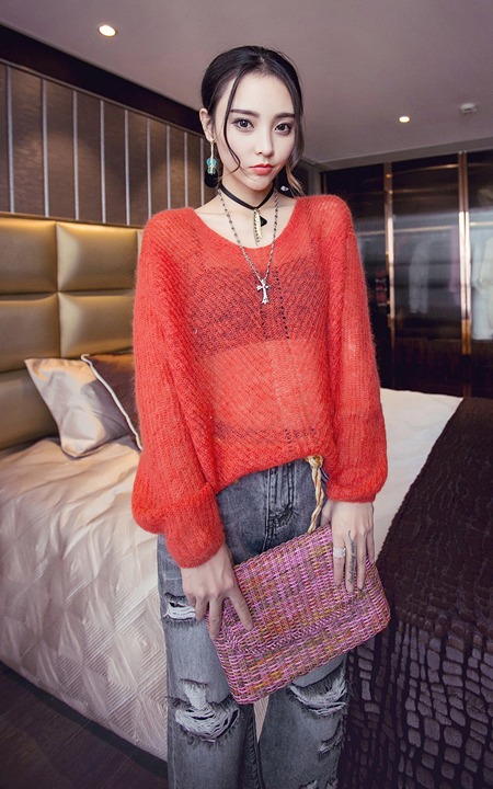 漂亮时尚的罩衫,透视的效果,散发迷人的魅力,下身搭配破洞牛仔裤,做旧的风格,大气有范儿!