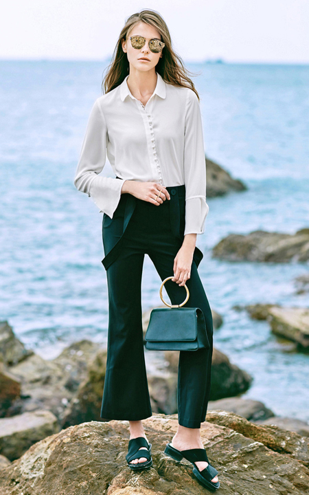 简约大气的衬衫,单排扣精致唯美,上身效果极佳,搭配背带休闲裤,喇叭的造型,散发迷人的风情。