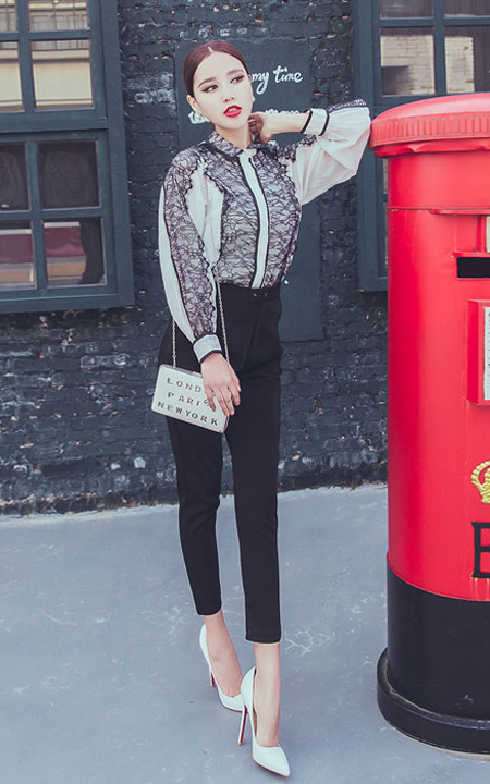 时尚大气的翻领衬衫,修身的剪裁,质感极佳,搭配优雅的半身裙,蕾丝拼接式的裙摆,散发迷人的魅力!