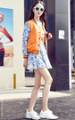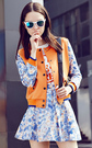 时髦的抽象印花袖拼接,休闲棒球服,搭配字母印花T恤和印花雪纺半身裙,街拍欧美风。