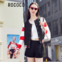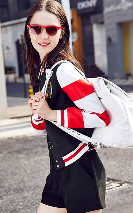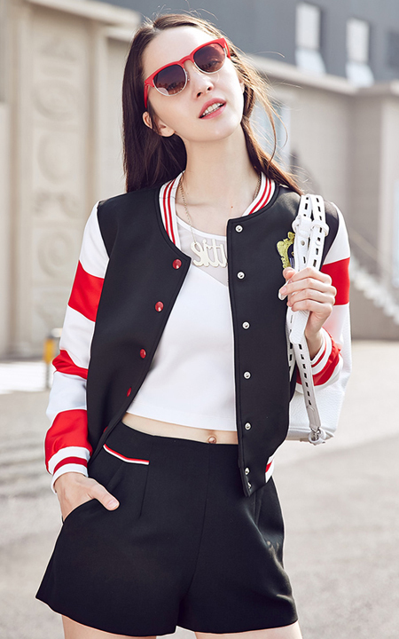 时尚立领,红白黑拼接撞色棒球服,搭配透视雪纺拼接t恤,穿条中腰阔腿短裤,街拍欧美潮范。