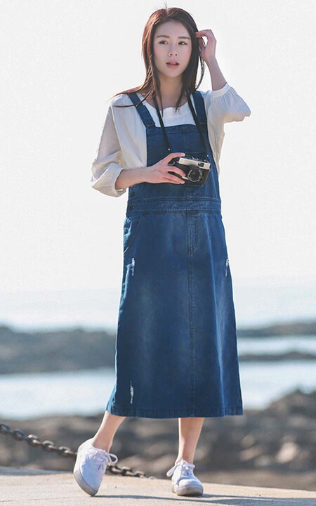 中长款牛仔背带裙,很有青春情怀的一款牛仔背带裙,看似直筒却有修身效果,搭配灯笼袖套头长袖衬衫,超级减龄,俏皮可爱的。