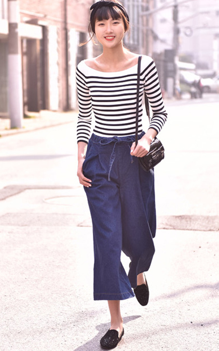 最简单最百搭的打底针织衫,细致螺纹肌理,简约却不单调,面料的质感柔软舒适,搭配蓝色阔腿裤,休闲范十足