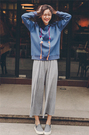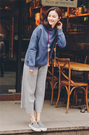 宽松的吊带+开衫两件套,棉麻的材质噢,上身很舒服呢,透气吸湿,橡皮粉很显肤白,搭配一字扣粗跟鞋,休闲又好看