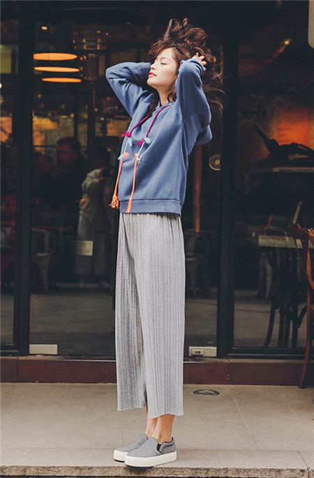 中长款抽绳宽松套头卫衣,搭配一条高腰牛奶丝阔腿裤,瞬间化身潮人,打造完美的混搭型格,展现出浓烈的复古风格。