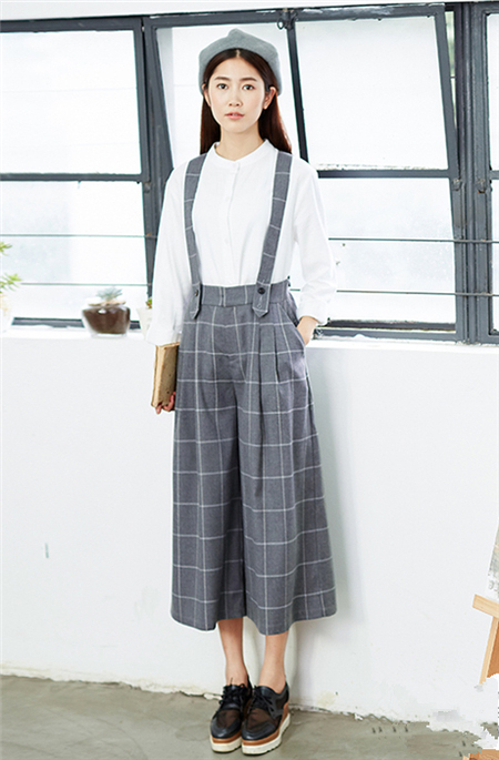 清新大方的白色衬衫给你优雅知性的气质,配一条格子背带裤文艺范儿十足,温婉知性女神气质尽显!