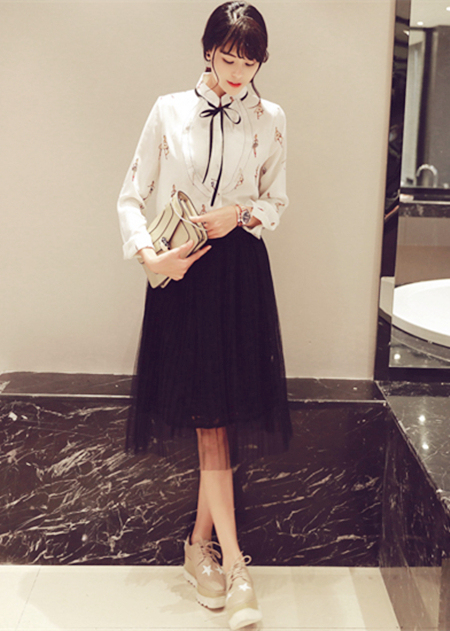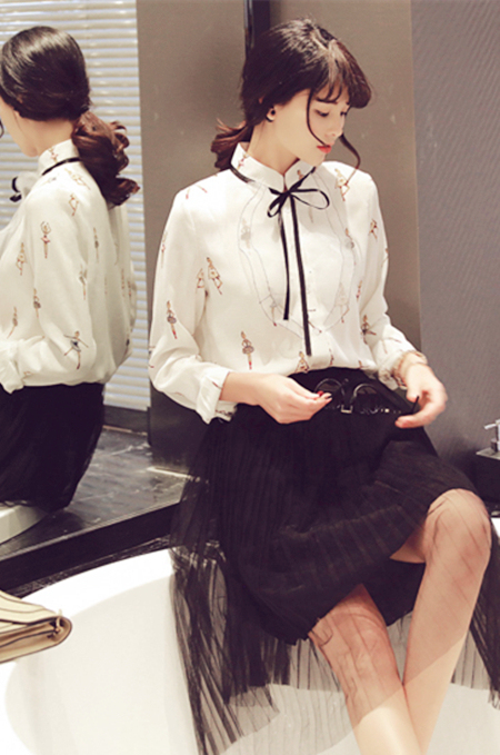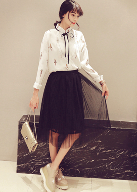 小清新甜美衬衫,衣身美女印花图案设计,尽显俏皮可爱感,搭配完美纱裙,真美呀,星星松糕鞋让你显高又赚足眼球哟~