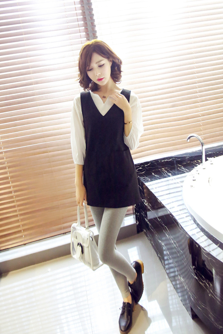 宽松的吊带+开衫两件套,棉麻的材质噢,上身很舒服呢,透气吸湿,橡皮粉很显肤白,搭配一字扣粗跟鞋,休闲又好看