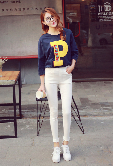 很简单一款T恤!衣身植绒字母搭配刺绣,时尚抢眼!除此之外没有多余的装饰!宽松的版型不挑身材搭配铅笔裤很棒哟~