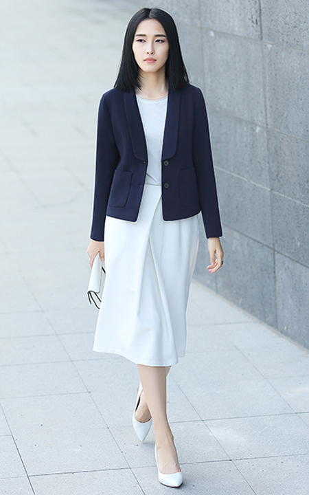 短款修身西装外套,青果领的设计休闲别致,手感舒适透气性好,搭配白色半身裙跟高跟鞋,沉静优雅
