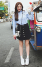 简约大方的蓝色衬衫,牛津布质地,趣味小猫印花,非常的时尚百搭,下着灯芯绒高腰半身裙,简简单单,优雅气质,日常超实穿