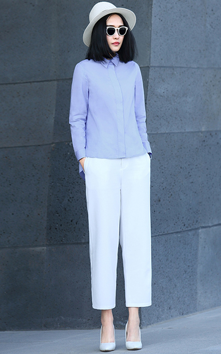春天一定要穿一款天蓝色的衬衫,把冬天的雾霾全部赶走,表面光滑细密,透气性能好,搭配白色阔腿裤,整个人看起来干净整洁