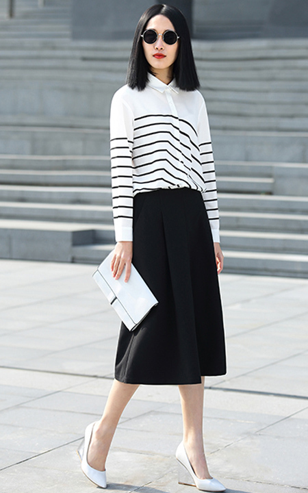 不对称黑白条纹印花衬衫,不过分花哨,也不显单调,手感软糯细腻,搭配黑色阔腿裤,满满的时尚感