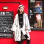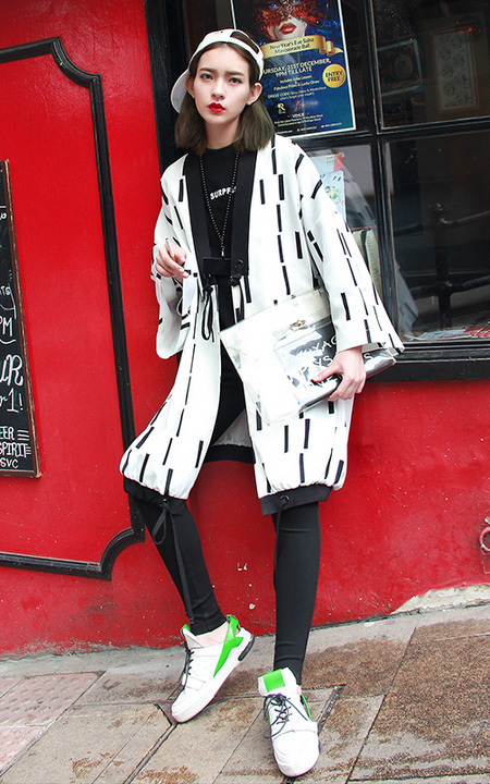 日式和服开衫披风外套,参差不齐的竖条撞色介入,中和黑白的呆板,穿绳大翻领与下摆穿绳相呼应,搭配T恤和破洞小脚裤很潮