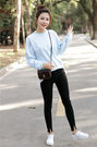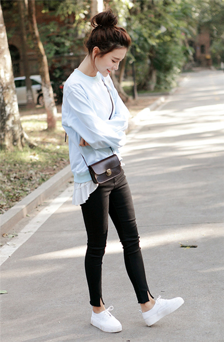 大V绣花圆领荷叶下摆套头卫衣,搭配一条开叉裤脚牛仔裤,瞬间减龄,活泼可爱,展现出你的甜美一面。