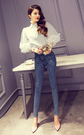 简约的一款白色衬衫,个性的袖子网纱拼接,凸显十足的魅力,搭配紧身牛仔裤,走到哪里都美美的!