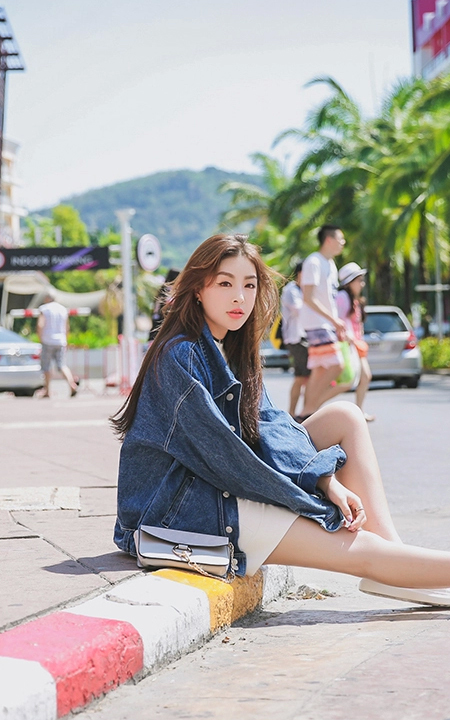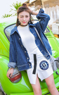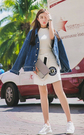 很有街拍感的牛仔外套,宽松休闲,很洋气很有范,内搭白色修身款打底衫,下着不规则开叉设计半身皮裙,非常吸引目光的一套