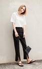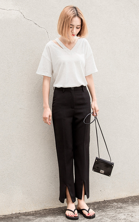 简约风格的短袖T恤,V型镂空设计领口,增添时尚小性感,下搭修身版型开叉设计小脚裤,简洁大方,很时尚的黑白配搭配。