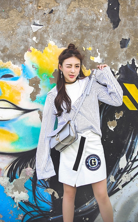 很洋气很有范的一款竖条纹衬衫,摩登喇叭袖,休闲时尚,内搭短袖打底衫,下着不规则设计皮短裙,摩登时尚,街头范十足。
