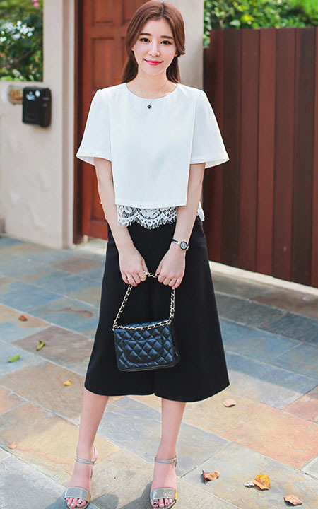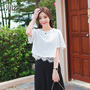 非常清凉的一款雪纺t恤,下摆拼接蕾丝花边,凸显女性甜美温婉的气质,搭配七分阔腿裤,简洁大气。