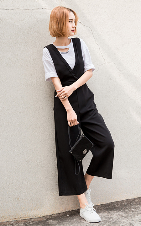 洋气有范的连体裤,V领型背带,宽松阔腿裤型,收腰版型,很时尚很显瘦,上身效果很赞哦,内搭镂空领口T恤,街头感十足。