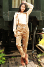 同色系的搭配,杏黄色上衣加上深一点的背带裤,森系的刺绣衬衫,花边领格外少女,搭配的背带裤也有着可爱刺绣,减龄哇~