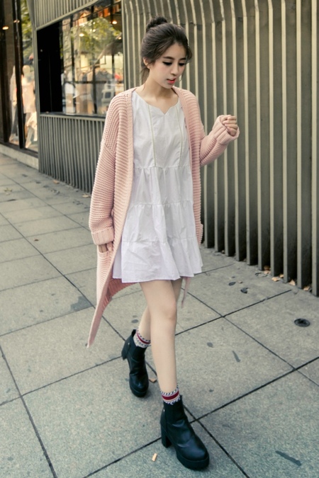 毛衣+连衣裙是非常经典的穿搭方式哦~长款毛衣配上宽松的连衣裙简单又有点小复古~搭配双小短袜和小皮靴就很好看哦~