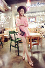 宽松的吊带+开衫两件套,棉麻的材质噢,上身很舒服呢,透气吸湿,橡皮粉很显肤白,搭配一字扣粗跟鞋,休闲又好看
