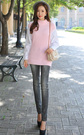 宽松的吊带+开衫两件套,棉麻的材质噢,上身很舒服呢,透气吸湿,橡皮粉很显肤白,搭配一字扣粗跟鞋,休闲又好看