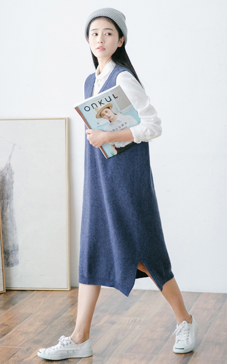 鸡心领针织背心裙,领口高低开得刚刚好,可以露出一小截内搭,增加层次感,背心裙的样式,内搭衬衫,简单清爽