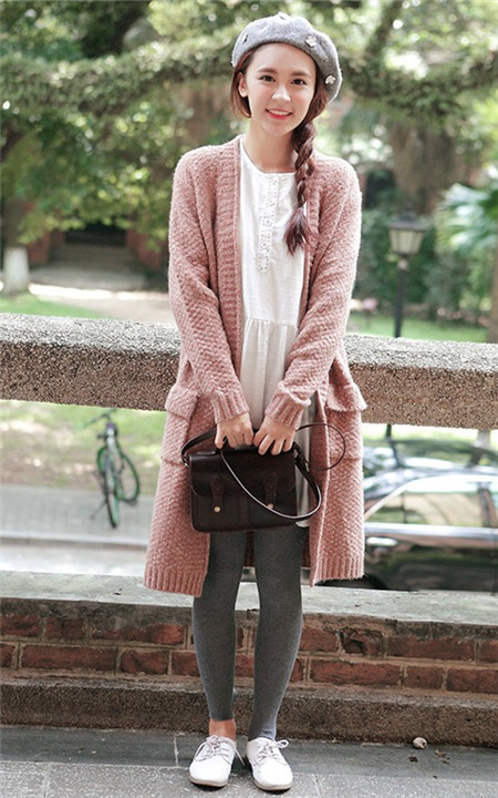 一件无扣开衫搭配一条简单的白色连衣裙+纯色的打底裤,配上一双百搭的小白鞋,甜美的出街哦。